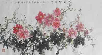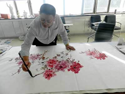 10月7日,当代著名画家王玉伟到访欧冠平台,受到公司领导热情接待。图为王玉伟即兴创作《花开富贵》。(办公室 冯继宏)