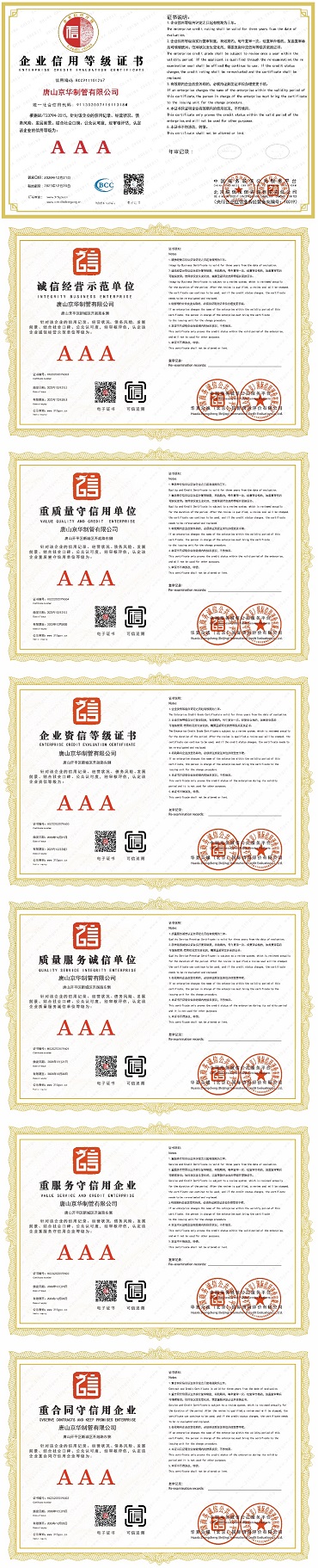 根据企业信用记录、经营状况、债务风险、发展前景、结合社会口碑、公众认可度,经过审核评估,欧冠平台被认定为“AAA级企业资信等级”、“AAA级企业信用等级”、“AAA级诚信经营示范单位”、“AAA级质量服务诚信单位”、“AAA级重服务守信用企业”、“AAA级重质量守信用单位”、“AAA级重合同守信用企业”。
